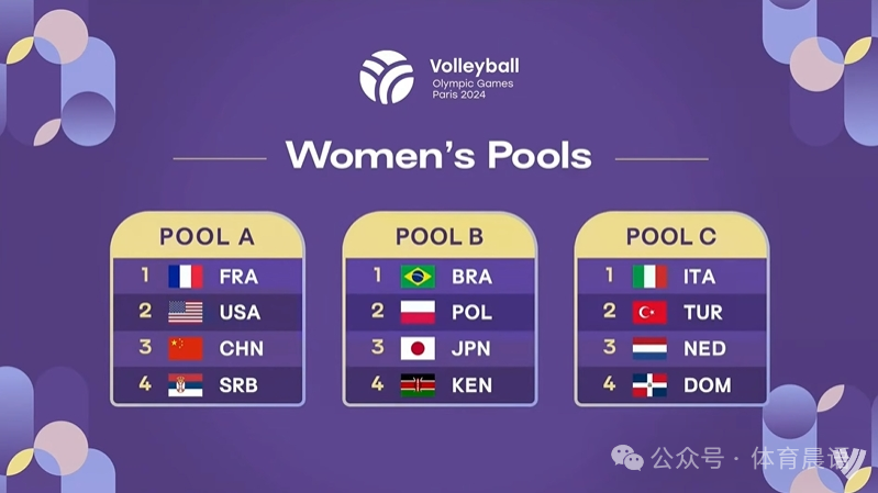 先不多说,我们先来看看本届巴黎奥运会女排比赛的分组。本次奥运会有12支女排队伍参加比赛,分为四个档次。第一档:法国(A组),巴西(B组),意大利(C组);第二档:土耳其,波兰,美国;第三档:中国,日本,荷兰;第四档:塞尔维亚,多米尼加,肯尼亚。作为东道主,法国自然是作为种子队分在A组。一般来说,东道主所在的这个组,其他球队的实力会是其他档次球队里面较弱的。然而,这次分组的抽签却让球迷们大跌眼镜。
