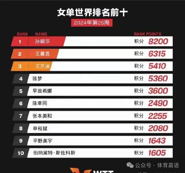 就在日前,国际乒联公布了最新一期的乒乓球世界排名,在这份排名里面,国乒方面孙颖莎以8200分遥遥领先。而在孙颖莎之后,就是王曼昱,她排名第二,积分为6315分。第三为王艺迪,积分为5410分,王艺迪之后是陈梦,积分为5360分。最新的世界排名出来后,国际乒联就按照惯例,自动给各协会世界排名前两位的选手,发出奥运单打比赛的邀请。所以,就出现了王曼昱被国际乒联邀请参加单打比赛的消息。由于陈梦排名第四,所以并不在被邀请的范围内。