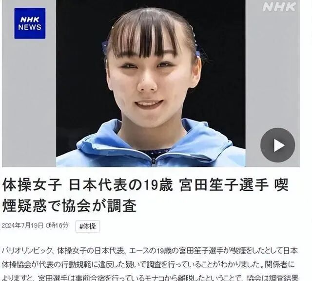 但是,让宫田笙子和喜欢支持她的粉丝们没有想到的是,宫田笙子的巴黎奥运之旅还未开始便已结束。日前,日本体操协会在东京召开紧急记者会,宣布代表巴黎奥运会参赛的体操运动员宫田笙子因违反守则,被开除出日本巴黎奥运代表队。据相关媒体的报道,日本体操协会专务理事西村贤二在发布会上表示,有“内部举报”称宫田笙子在6月底至7月初期间有吸烟行为,并曾私下在国家训练中心喝酒。
