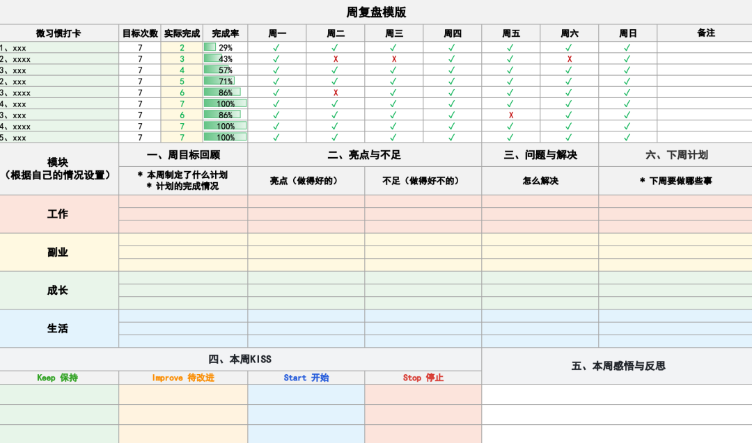 分享一个我每天、每周、每月都在用的变强复盘模板,只用花5-10分钟。