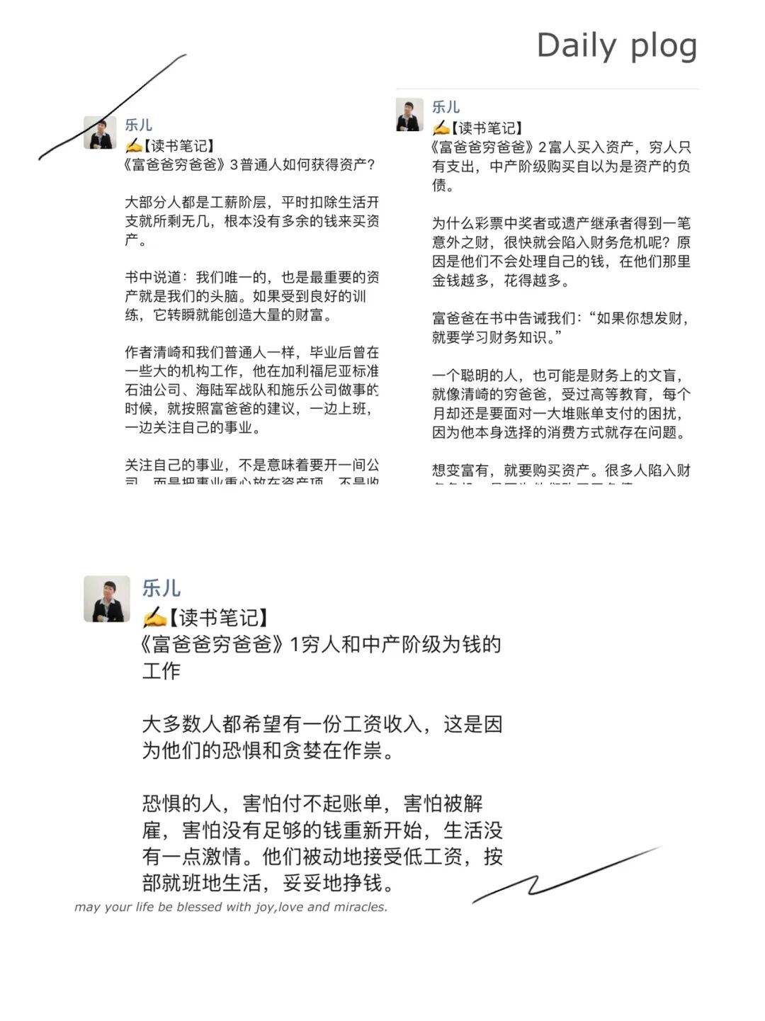 这本书让我受益颇多,它给我普及了许多关于财富投资、负债、财务自由等理念,我还写了几篇读书笔记发朋友圈。