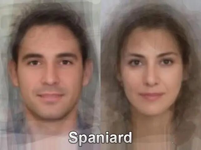 上图为经合成的西班牙人“平均脸”,主要特征为:深棕色或黑色头发,瞳孔呈棕色,肤色较深。