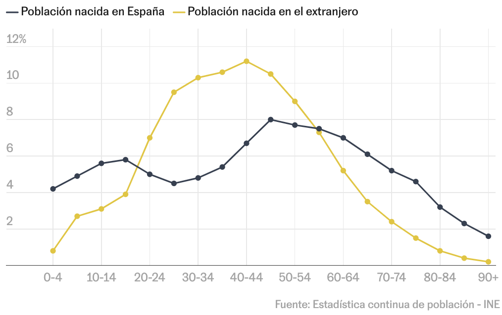 Seis de cada diez extranjeros tienen menos de 44 años, prácticamente la misma proporción de españoles que tienen más de esa edad.
