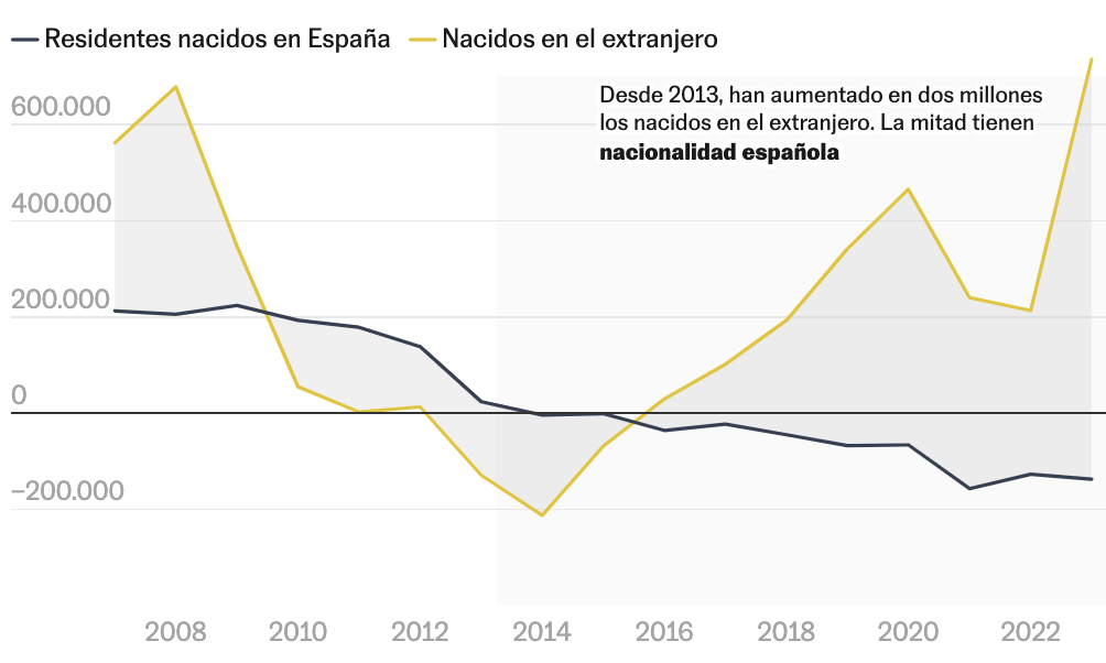 En la última década han aumentado en dos millones los residentes de origen extranjero y casi la mitad tienen nacionalidad española (muchos son nietos de españoles que emigraron). Mientras, los nacidos en España han disminuido en 600.000 personas.