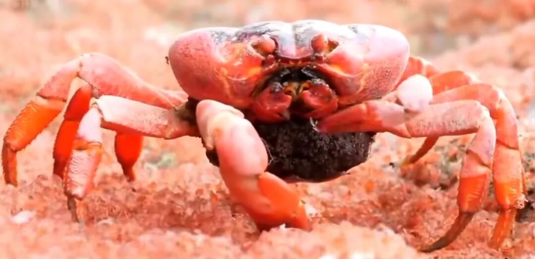 在圣诞岛上,有一种红蟹,一次产卵10万枚,刚出生的红蟹只有5毫米。随着一天天长大,眼前是红彤彤的一片移动红点。