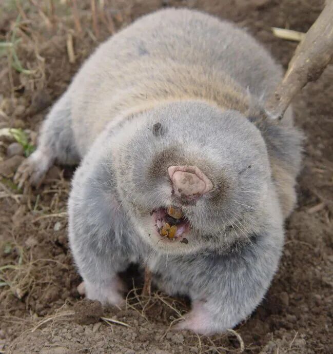 老鼠是尖尖的嘴巴,鼢鼠的嘴巴截然不同,像猪一样,脸部宽长,眼睛细小,整个全身就给嘴部和四肢留了个空隙不长毛,嘴巴和四肢都粉红红,身形比老鼠大很多,看起来毛茸茸,让人很想摸一摸。这家可没有看起来那么可爱,最很多年前,农民的粮食紧张,地里中的红薯,土豆等,到秋天的时候都会东一个片区、西一个片区留出多个空缺,原来是鼢鼠把土里藏着的根茎咬断了。刨地小能手是鼢鼠的一个功能,又名“地羊”,它的牙齿尖长,像羊的角一样挖地可厉害了。要是可以培养出来,帮助挖地道战就好了。