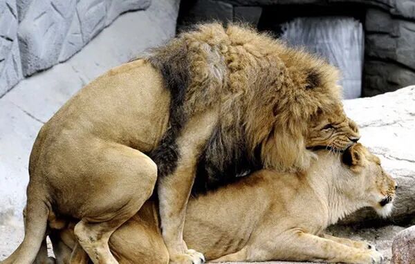 狮王缓缓用两只前腿抱住雌狮子,拱起背,压低了腚部,对准了位置,开始了间断二十多次的交配活动。