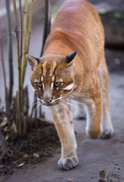 头顶有M型花纹,和老虎非常相似,身体却像豹子一样,尖怂的耳朵竖立,圆鼓鼓散发出凶残的眼光,素有“林中战神”的称号就是金猫。