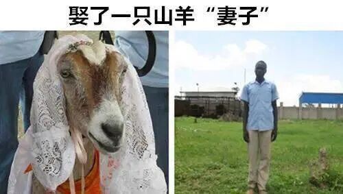2006年,名叫CharlesTombe的苏丹男子偷偷与一只羊频繁接触,被大家发现后,被迫结婚,并给了羊主人15000苏丹第纳尔币(580元人民币)聘礼。