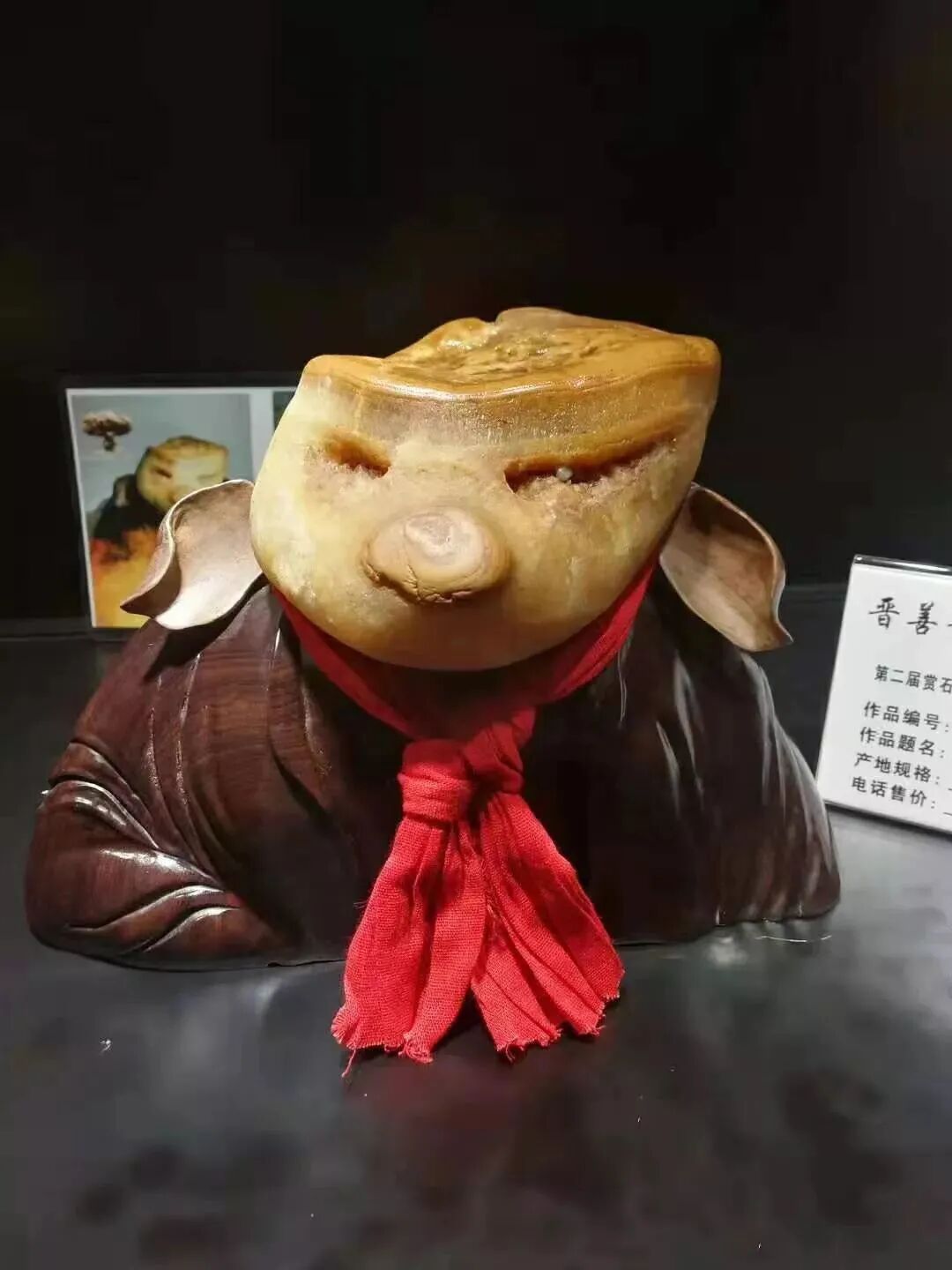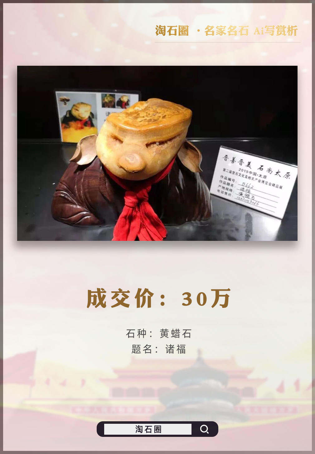2019年3月10日下午,太原石博会精品展现场传出喜讯,一块黄蜡石象形石以30万元的高价成交!这方石头产自江西信江河,属于晶蜡,色泽米白到浅黄,质地一般,但形生得奇特,活象猪八戒的头。