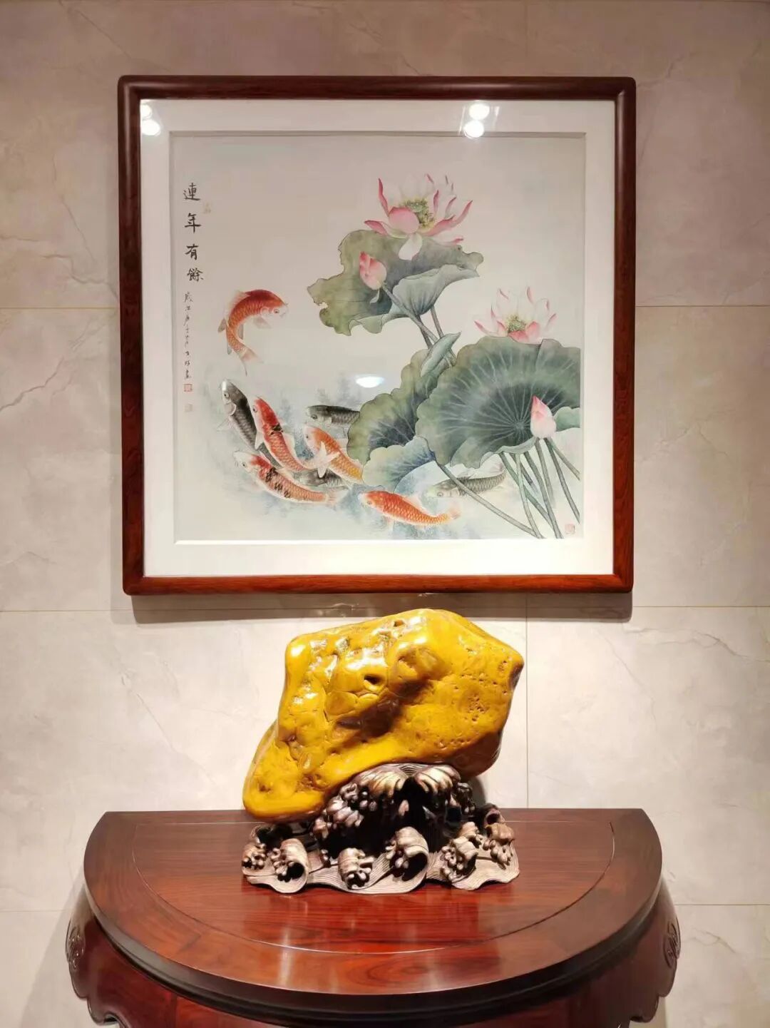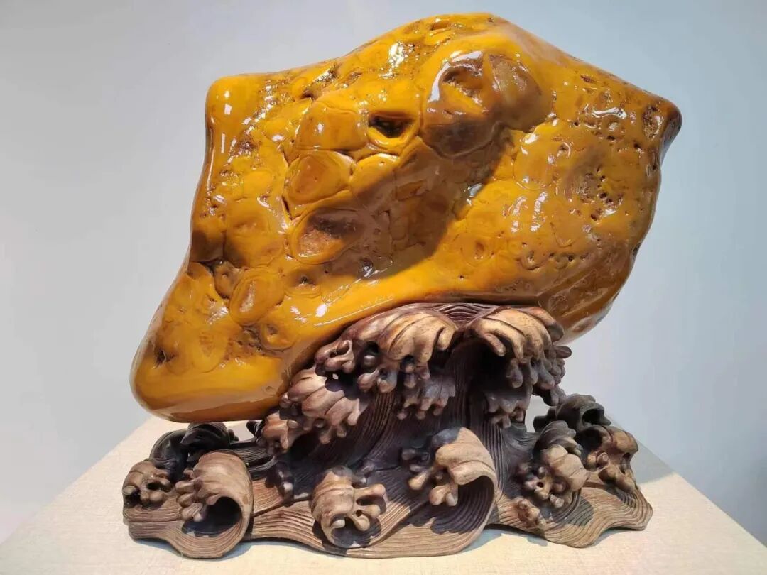 某年十月初,贺州赏石收藏协会会长颜峰,常务副会长尹炳毅,秘书长韦德宝一行人去广东连山县向兄弟协会学习,拜访李全超老会长时,尹常务看到这方质地细腻,纹理清晰,型态优美且颜色金黄鲜艳的藏品并了解了它的来历后,觉得这方宝石对石文化的传承,是具有非常重要意义的!