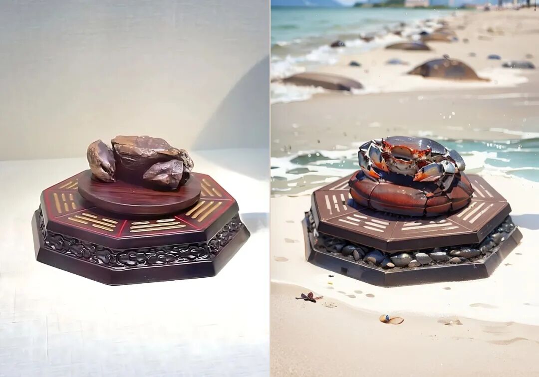 “螃蟹”奇石能平稳放在八卦台上,螃蟹有着八条腿,八足横行,“八”谐音发,象征着八面来财、财运亨通。而“八卦底座”也是对应八个方位,与螃蟹在财运上的寓意完美契合“八方来财”!