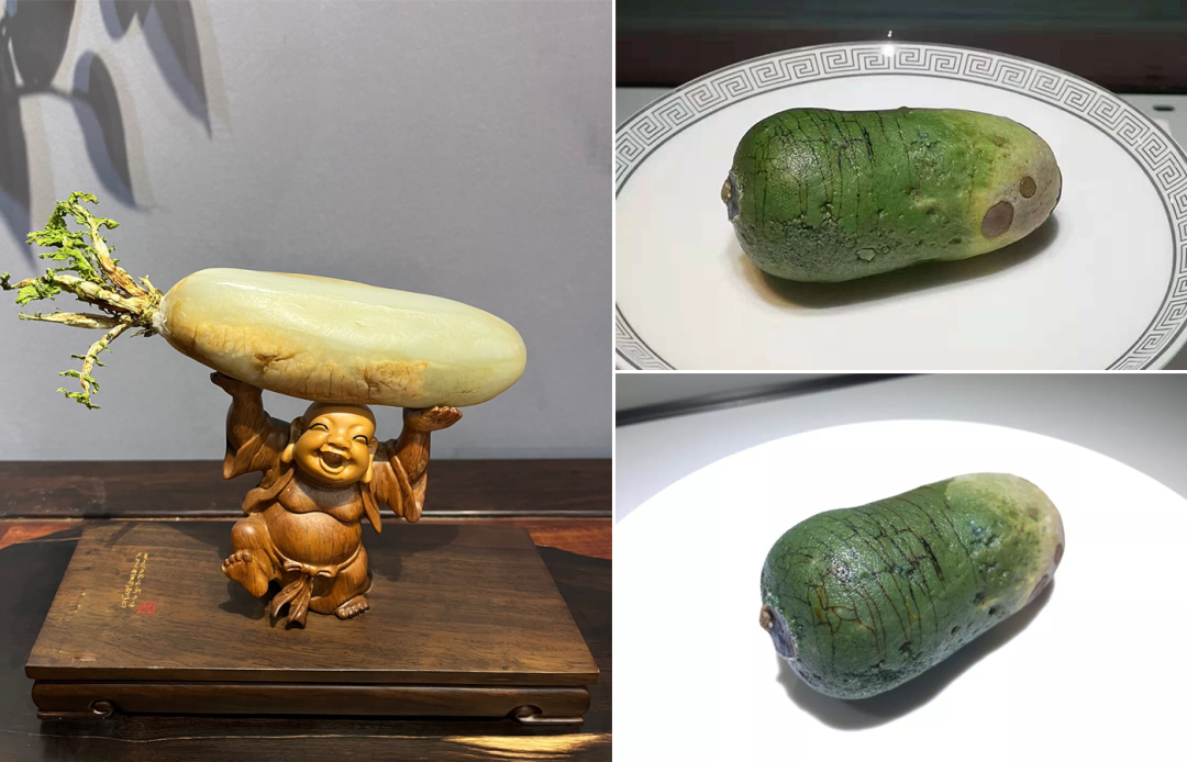“青萝卜”胜在相似度,从皮到根,再到果锈,呈现出一种从青涩到雪白的渐变,与真萝卜是相似度不低于90%。而“白萝卜”凭借和田玉的油润质地,仿佛比真萝卜更水润 ,更美味,玲珑剔透,让人垂涎欲滴。三个萝卜奇石您更中意哪个?