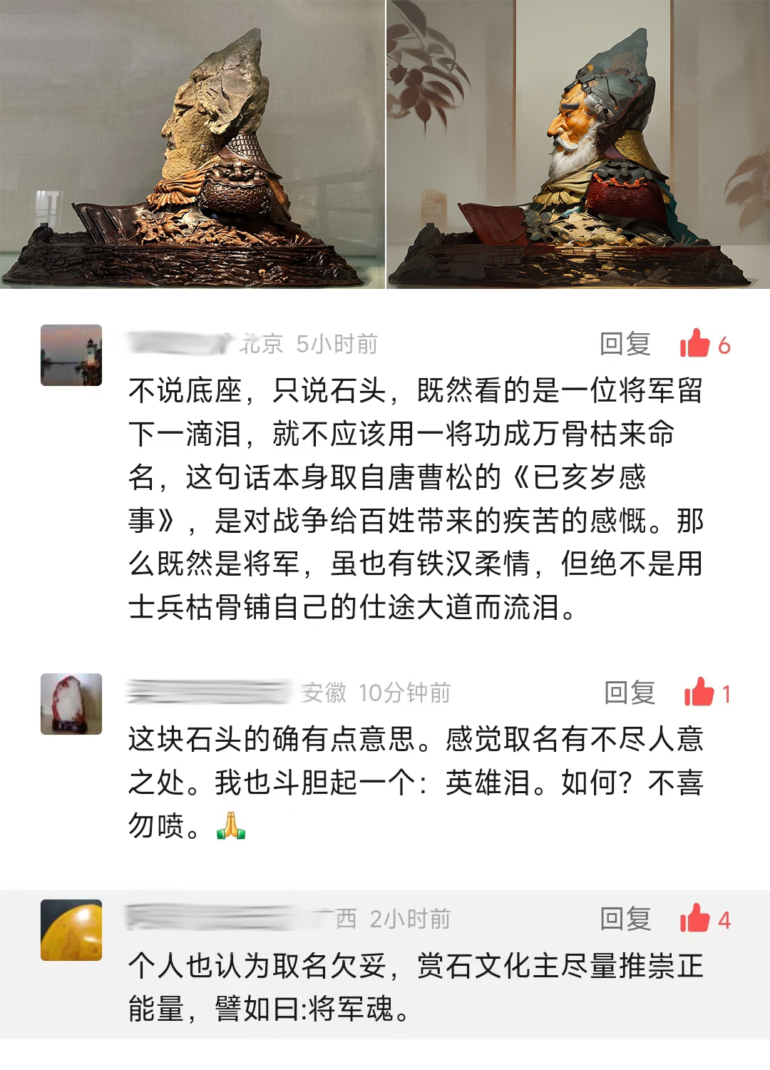关于“一将功成万骨枯”的名字,在仅有的几个评论里,还是有三个持有不同意见的说法。一位石友提出,赏石文化尽量推崇正能量。这个观点恰好我们刚经历过一次。