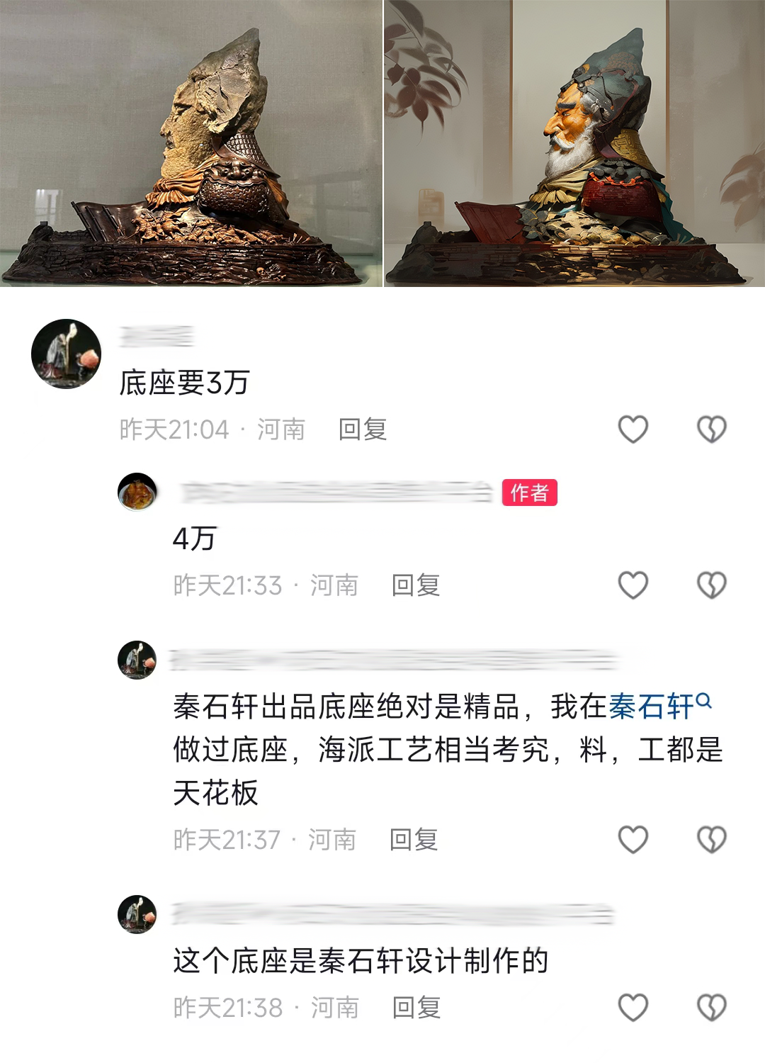这块石头的成名和底座有莫大的关系!从评论区这个对话我们可以看到,石友对秦石轩的品质还是非常认可的。底座3万,4万的说法未经考证,先不评价。反过来想,从别人家做底座,可能你舍得花钱,他们还做不出满意的效果。