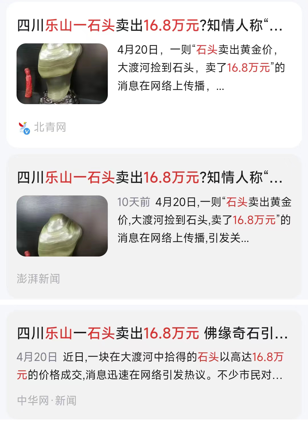 这些官媒给出的稿件观点一致是:石头卖出黄金价,大渡河捡到的石头16.8万成交。网友表示:万万没想到。