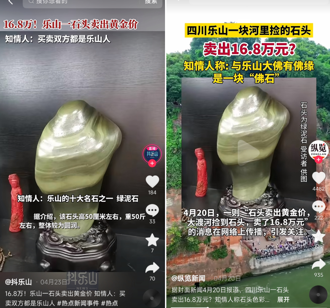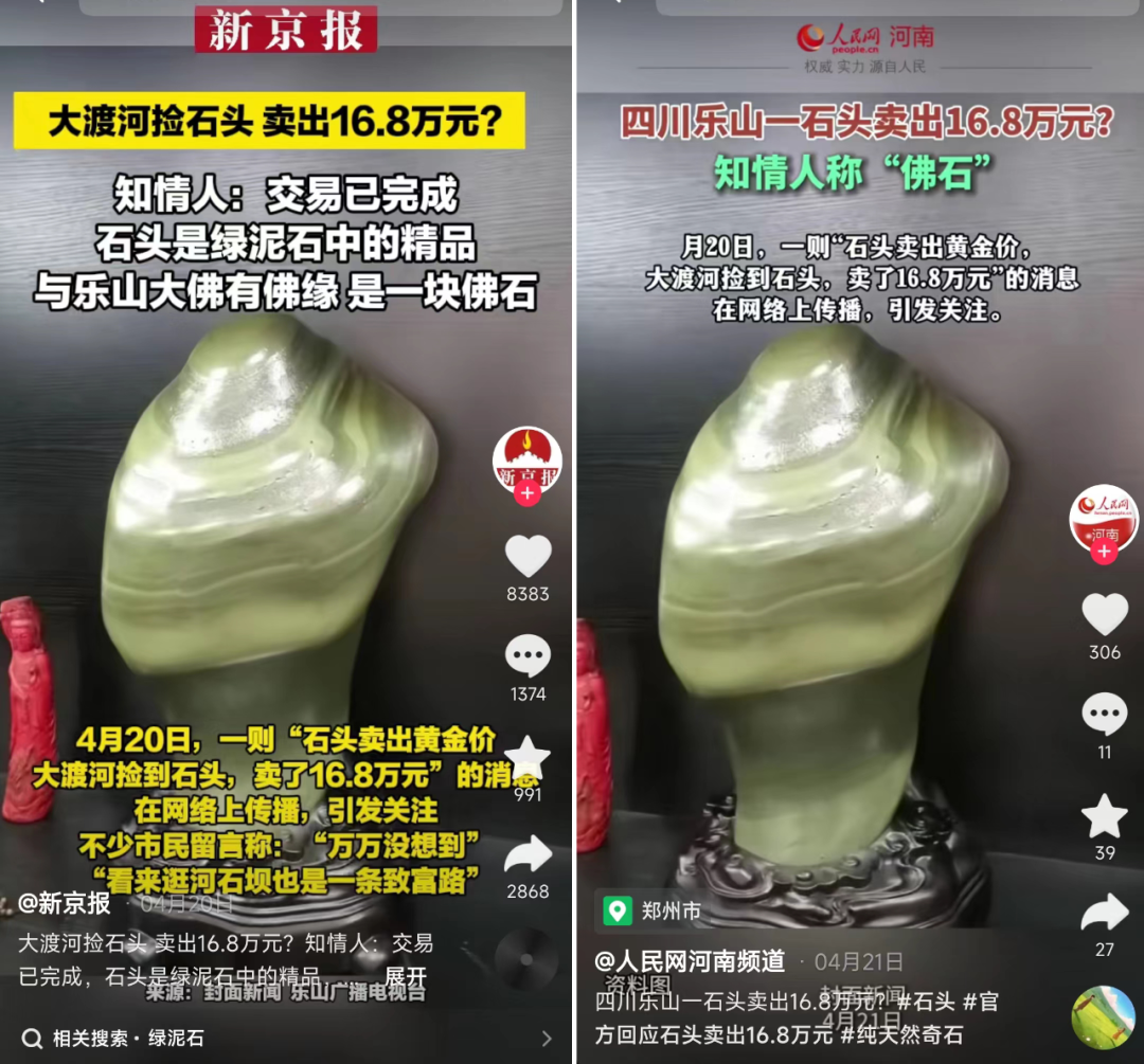 但是要从“曝光量”这个维度来看,有一块石头,那是得到了多个官媒的“追捧”!它就是来自四川乐山的一块大渡河的石头。说是和乐山大佛有缘的一块绿泥石。刊发的媒体有多大?新京报,人民网河南,中华网,封面新闻,澎湃新闻等都出了图文和短视频的报道。