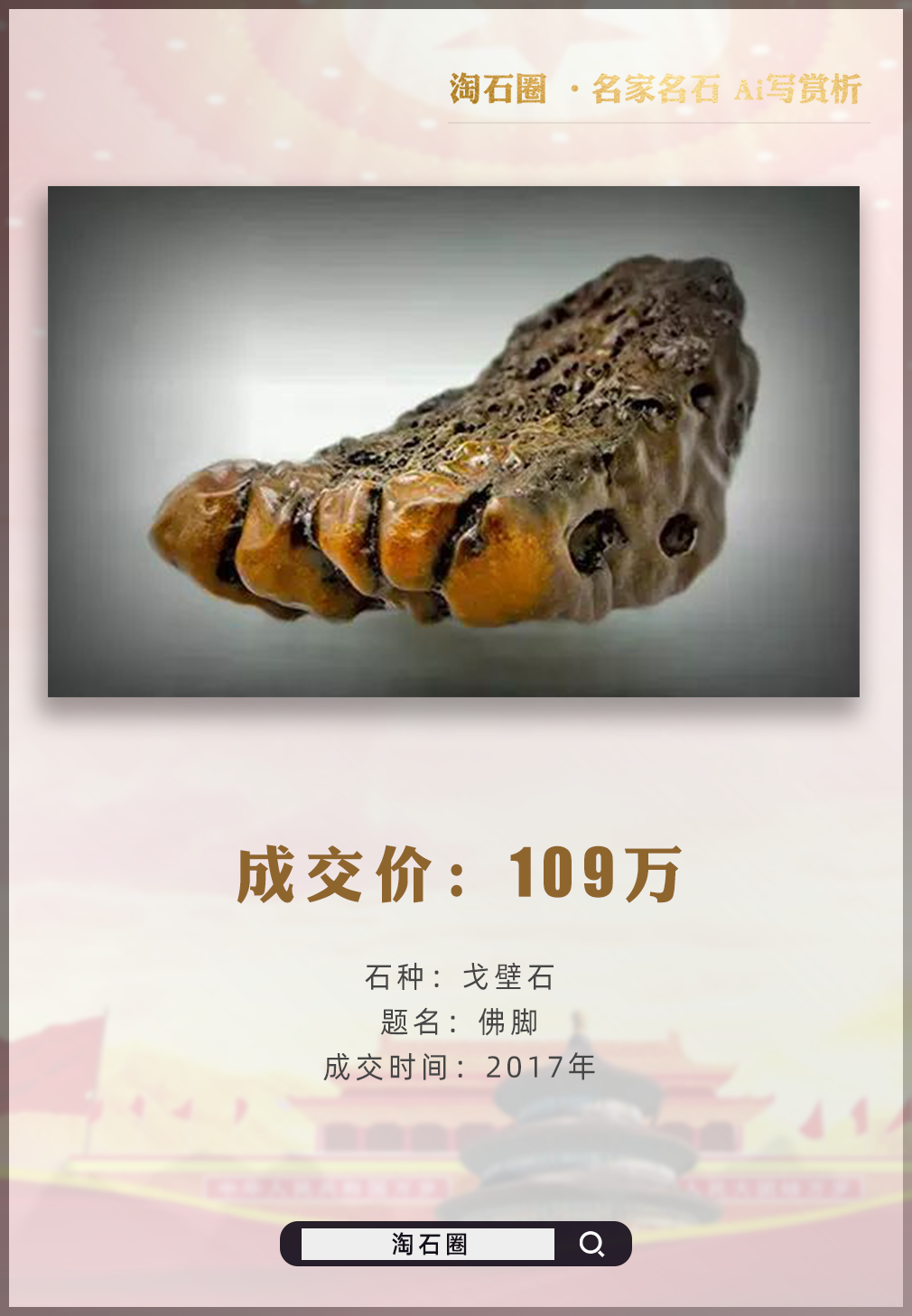 戈壁石《佛脚》2017年109万成交;灵璧石《清纹雅韵》2017年120万成交;灵璧石《盘龙云海》2017年150万成交等等。红河水冲石《凤求凰》2017年86万成交。