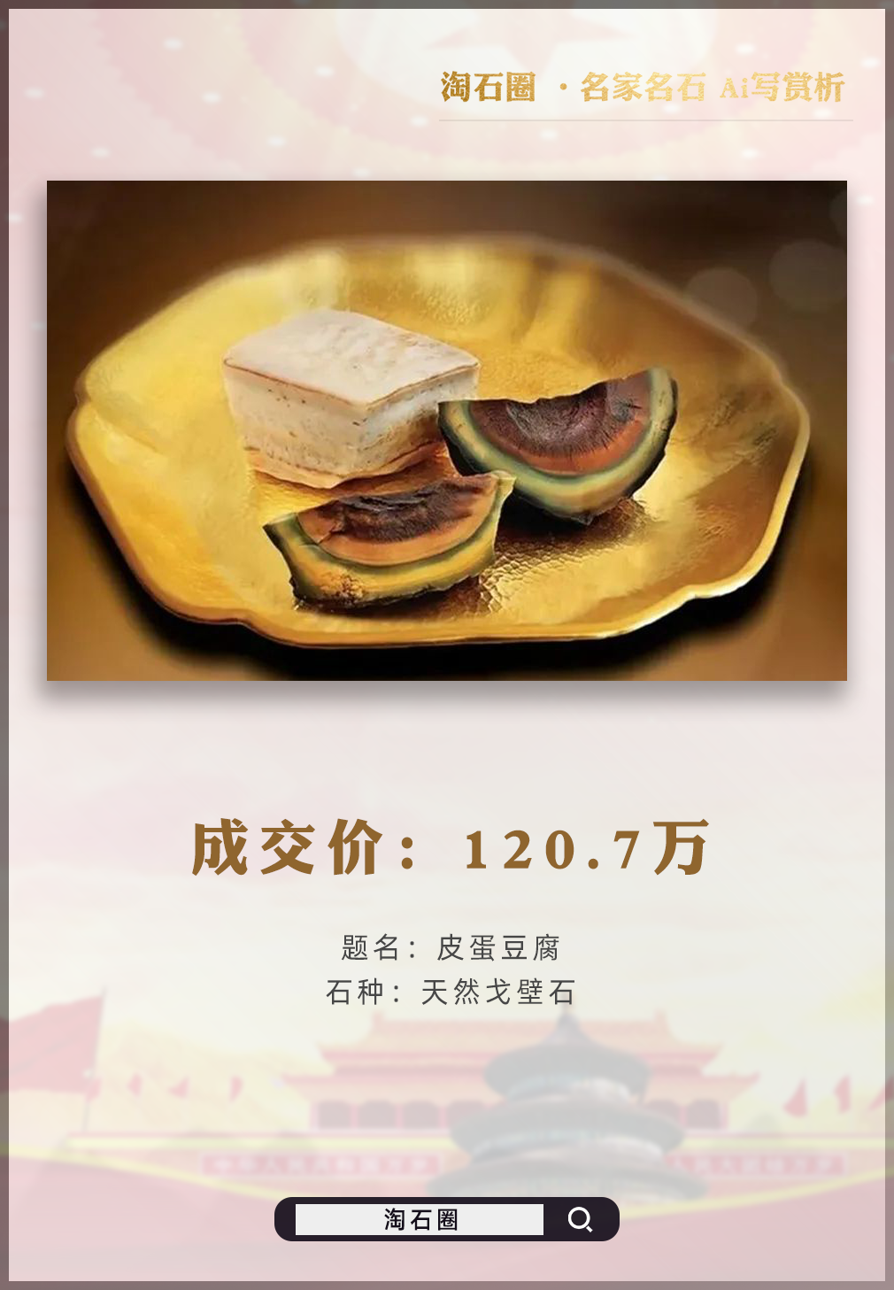 上了国际拍卖的戈壁石组合《皮蛋豆腐》也是2017年拍卖拍出120.7万的高价;并且是迄今为止唯一上了国际大拍的现代赏石藏品。