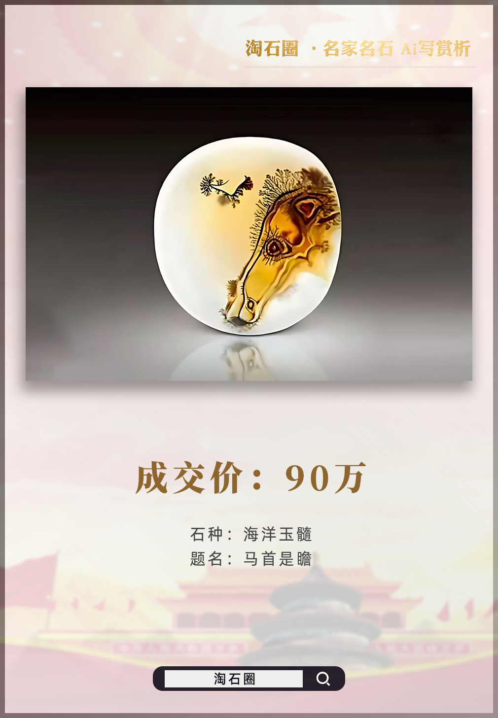 海洋玉髓《山人遗墨》2017年350万成交;海洋玉髓《马首是瞻》2017年90万成交。