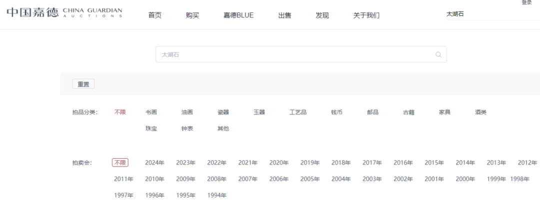 为了了解这块名石更多信息,我们查阅中国嘉德官网,自1994年到2024年30年里公开拍卖的太湖石里没有与此石一致或者接近的信息。