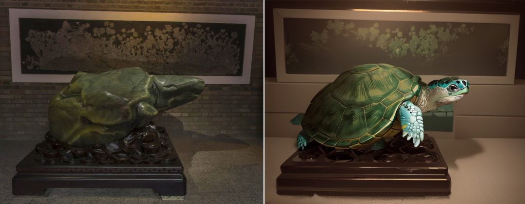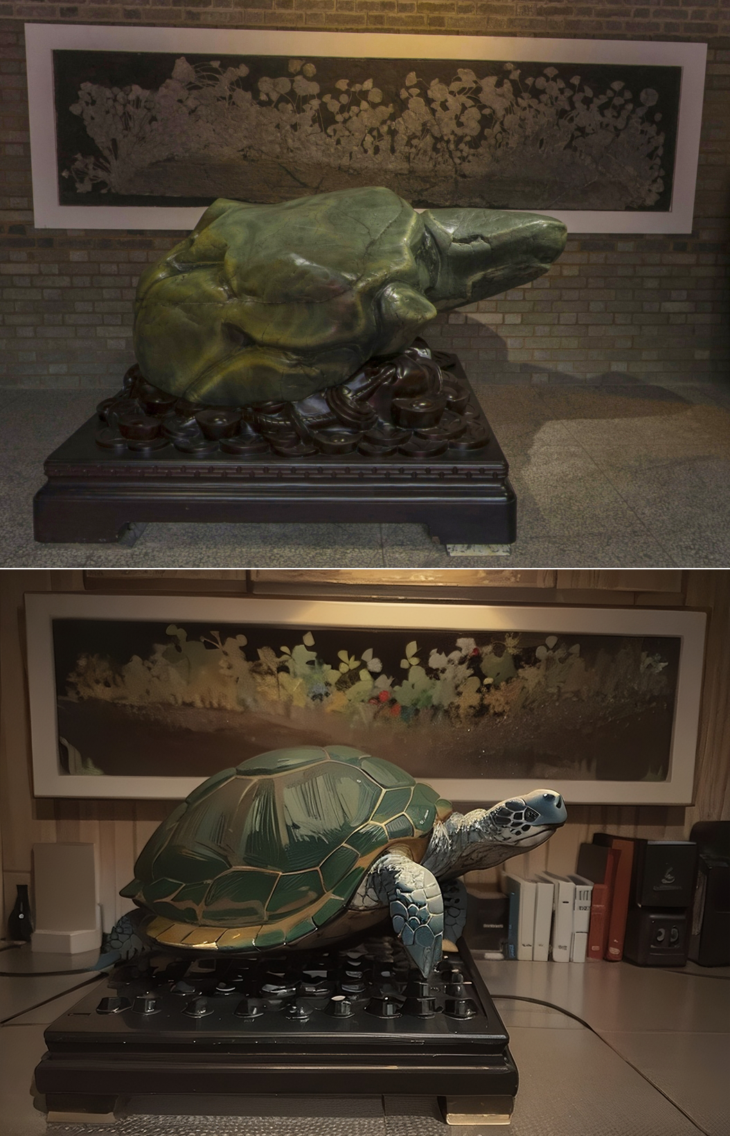 这块石头是绿泥石,重达5吨,既有龟的头,也有龟的壳,墨绿色的色彩也和龟的主要色彩温和。像这种体量的巨石,即使没有什么模样都不会便宜,更何况它不但大,而且还非常像!