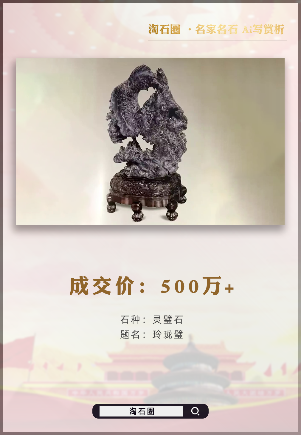 从此以后,《玲珑璧》的价值不断攀升。2016年,这块珍贵石头以500万元和南京商用房交易,总价值接近1000万元。这一高价成交引发了广泛关注,不仅凸显了高端奇石的稀缺性,更推动了石头价值的不断攀升。