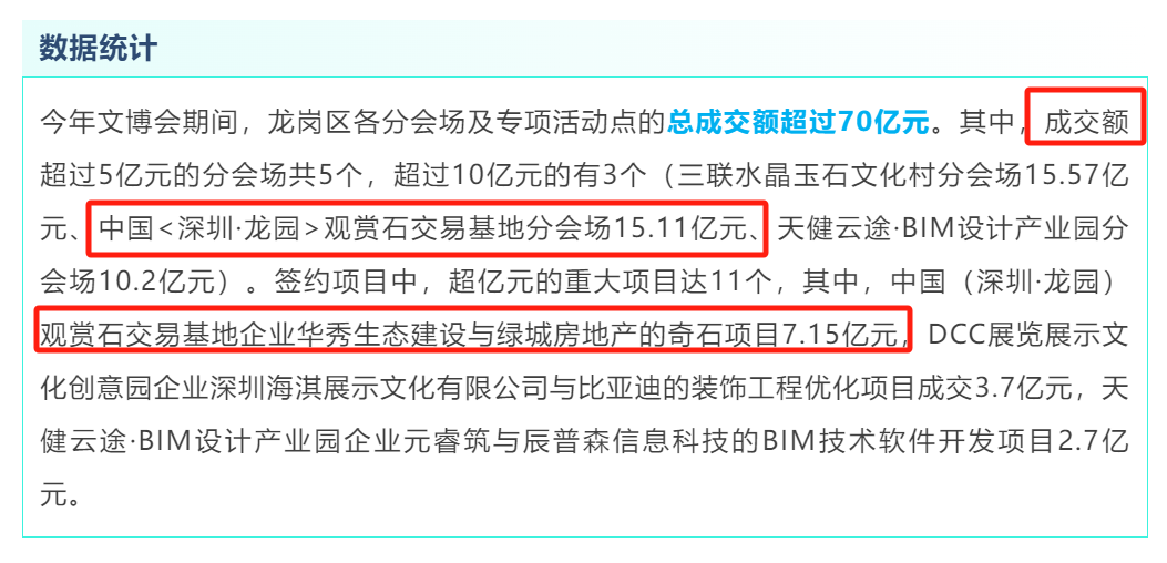 现在回到题目,“成交额15.11亿!谁在龙园石展疯狂扫货?”根据官号“深圳龙岗发布”的消息,深圳文博会的成绩是70亿。中国<深圳·龙园>观赏石交易基地分会场成交额15.11亿元。