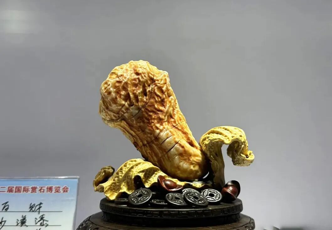 在青岛石展上看到的这块大渡河的“佰财”奇石,呈墨绿色,整体浑圆,一头小,另一头大,纹理也和真的白菜叶子一层层包裹一样,非常有神韵。白菜谐音“百财”,象征财富,富饶,也有招财和发财的寓意。白菜主题有很多藏品,每个石种里拔尖的往往很突出。今天看到的这两个就是不分伯仲。