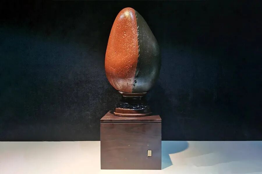 饱满的块面,高反差的色彩,居中一条优美的弧线,成为点化石体审美内涵的分割线。阴阳割昏晓,一线划开红黑二色,红色如初升的旭日,热烈奔放,充满张力。另一侧的黑色,如同恬淡沉寂的夜,沉静深邃,无限包容。石敲开心门,遵循了审美中的对称、分割、反差等规律,将几何感受化,融进了想象,糅合了文化,扩大了审美的内涵和外延。如此,这方石就走进了心里,住了下来。