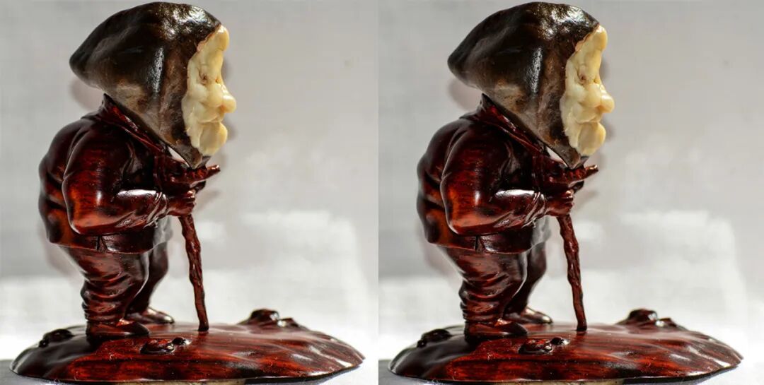 弯腰,屈膝,身材岣嵝的老人,裹着头巾。俏色让脸部和头巾有鲜明的界限。侧脸上能看出额头微凸。