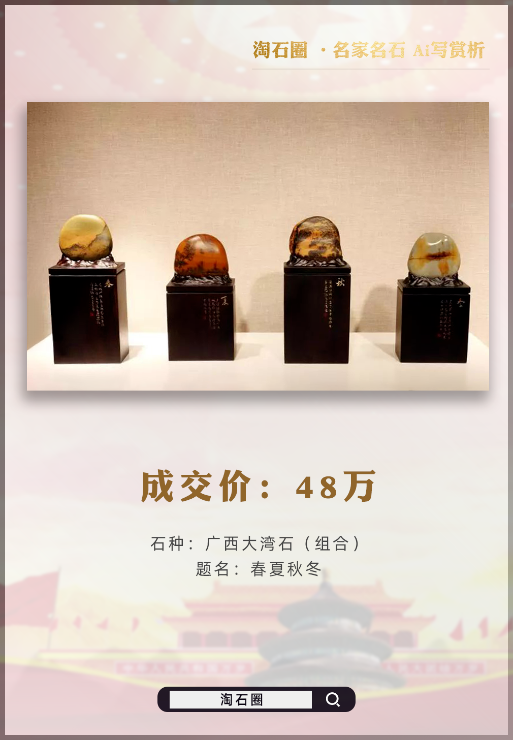 这四季画面石以48万元的高价成交,突显了大湾石画面石的魅力。这不仅是一次收藏交易,更是对艺术的崇敬和对大自然的致敬。这组作品成为了传世之宝,让人们在品味中感受到了自然的奇妙和艺术的魅力。