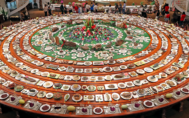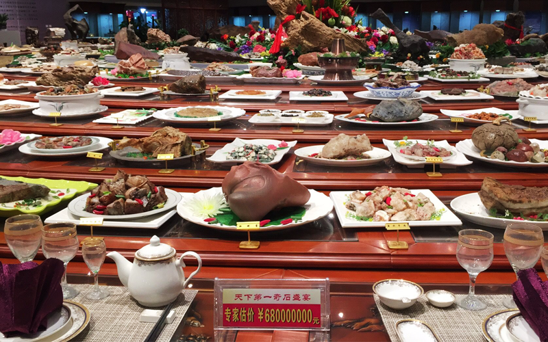 因此,搞“奇石宴”或“满汉全席”的藏家很多,六月出安康石展见到一桌奇石宴,现在西安世博园的自然奇石馆也有一大桌“奇石菜”。有些石展的摊位上也会有藏家摆出“奇石宴”。但是如果你知道哈密那一桌1088道菜的天下第一宴。其他的各种“奇石宴”都显得不那么值钱了。