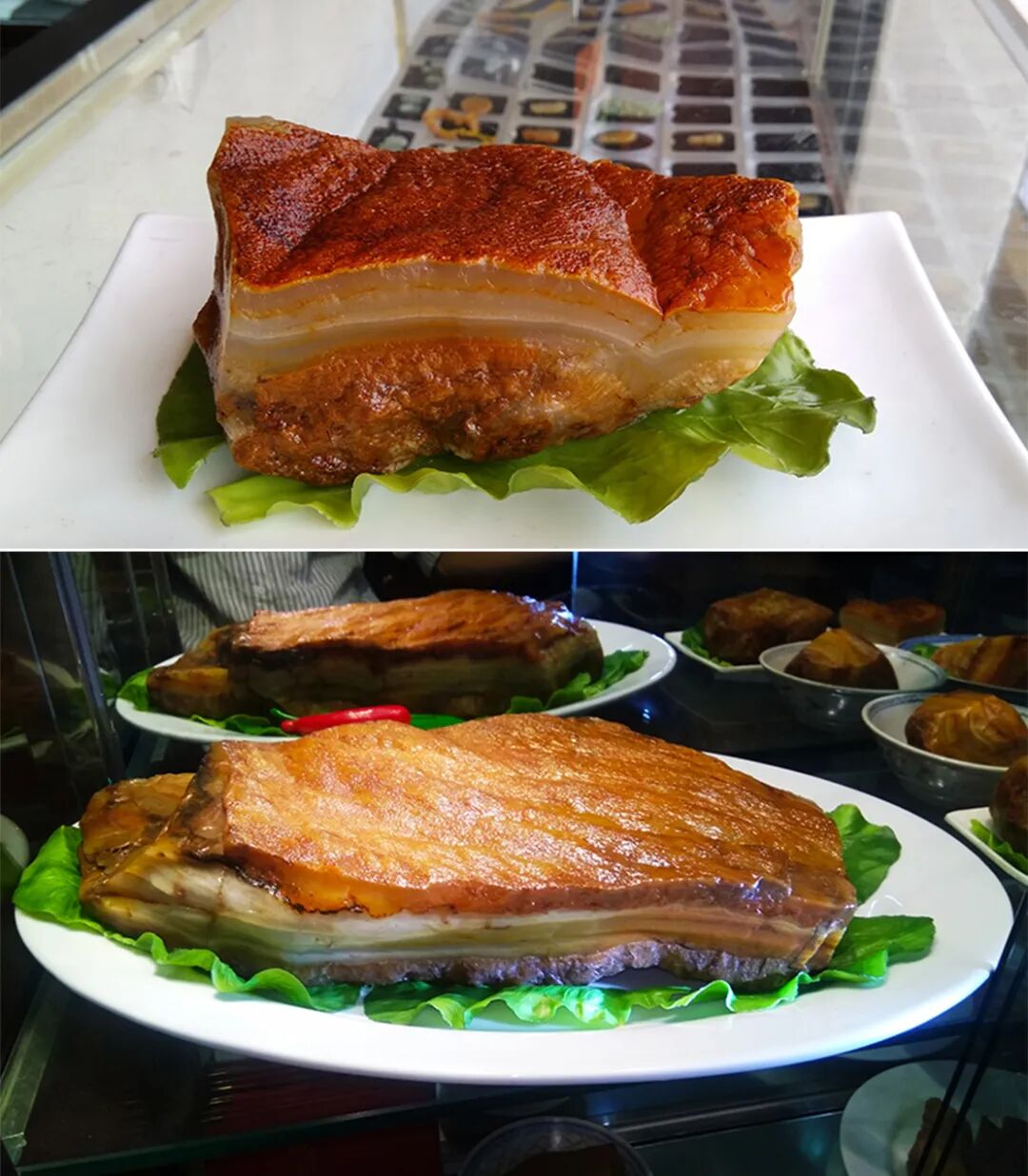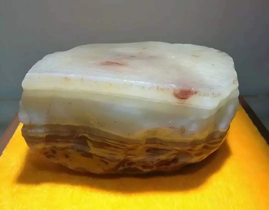 在2016年时候,二连浩特举办石展,云集了大量的肉石,其中有一块白净通透的肉石,质感上乘,皮肉层次分明,毛孔清晰,似水晶肘子。几点淡红色如血色印染,使这块肉逼真形象,好似能闻到浓郁的香气。