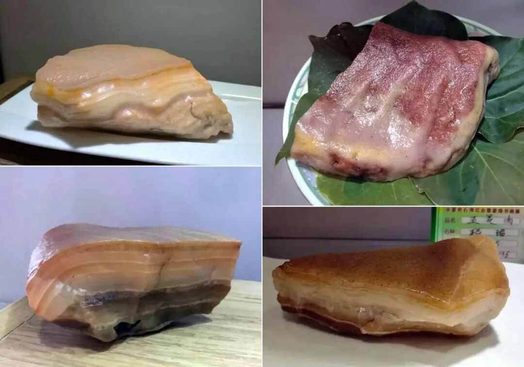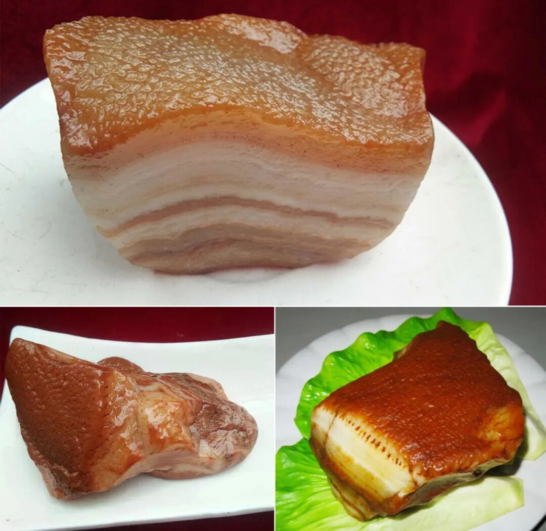 阳江肉石以其色泽和质感而著名。因其外观酷似鲜嫩的猪肉而得名。阳江肉石呈现出自然的红色、粉色和白色,仿佛一块刚切开的生猪肉。这种色泽是由石头中的矿物质和沉积物长期作用而形成的,显得非常逼真。
