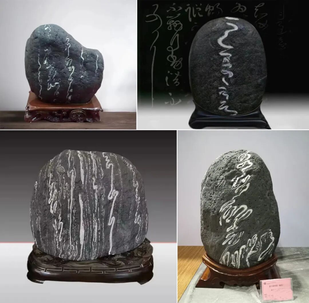 由于黑色石头上,白色纹理形成的线通常很难对应具体的字,或者图形,所以普遍是朝着“天书”的方向解读。而书法艺术中的各类狂草字体普通人很难分辨,所以用它去解读云朵石上的线条是非常合适的选择。