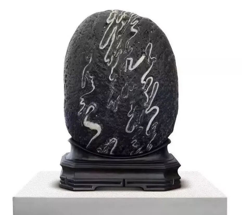 这块云朵石最大看点在于毛体狂草书法的韵味。也是众多的云朵石里非常著名的一块石头。云朵石黑白分明,视觉冲击力强,白色纹理通常构成神秘图案和文字,具有独特价值。