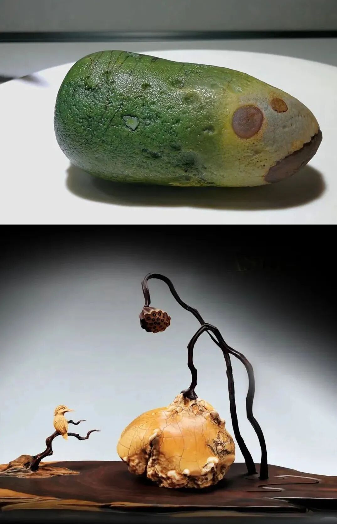 比如把58万的“青萝卜”和这个小石头放一起时候,很多人不会知道他两之间有什么关联。实际上,它们出自同一位藏家之手。