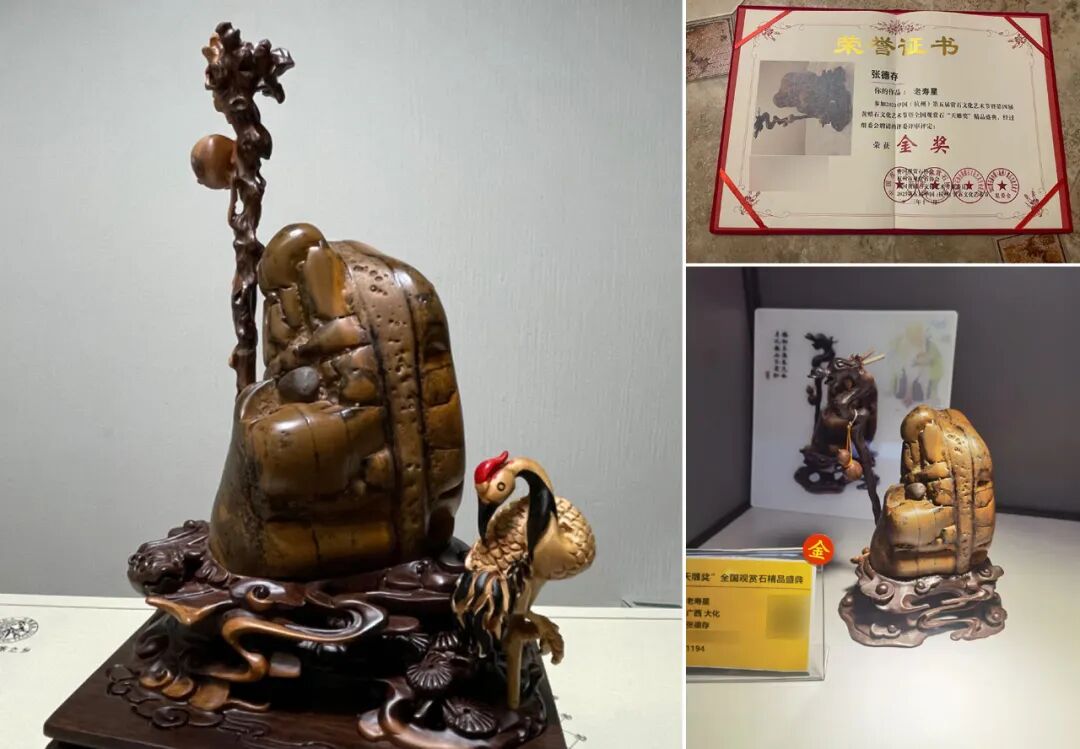 去年杭州石展,张先生将大化石“老寿星”送展,荣获金奖!现场石友和专家无不称赞这方夺天地之奇,整体形状、纹理清晰,包浆浓厚,色彩艳丽古朴,塑造出如此惟妙惟俏的形象,就好像亿万年岁月遗留下的独特印痕,历经岁月沧桑,堪称奇迹 。