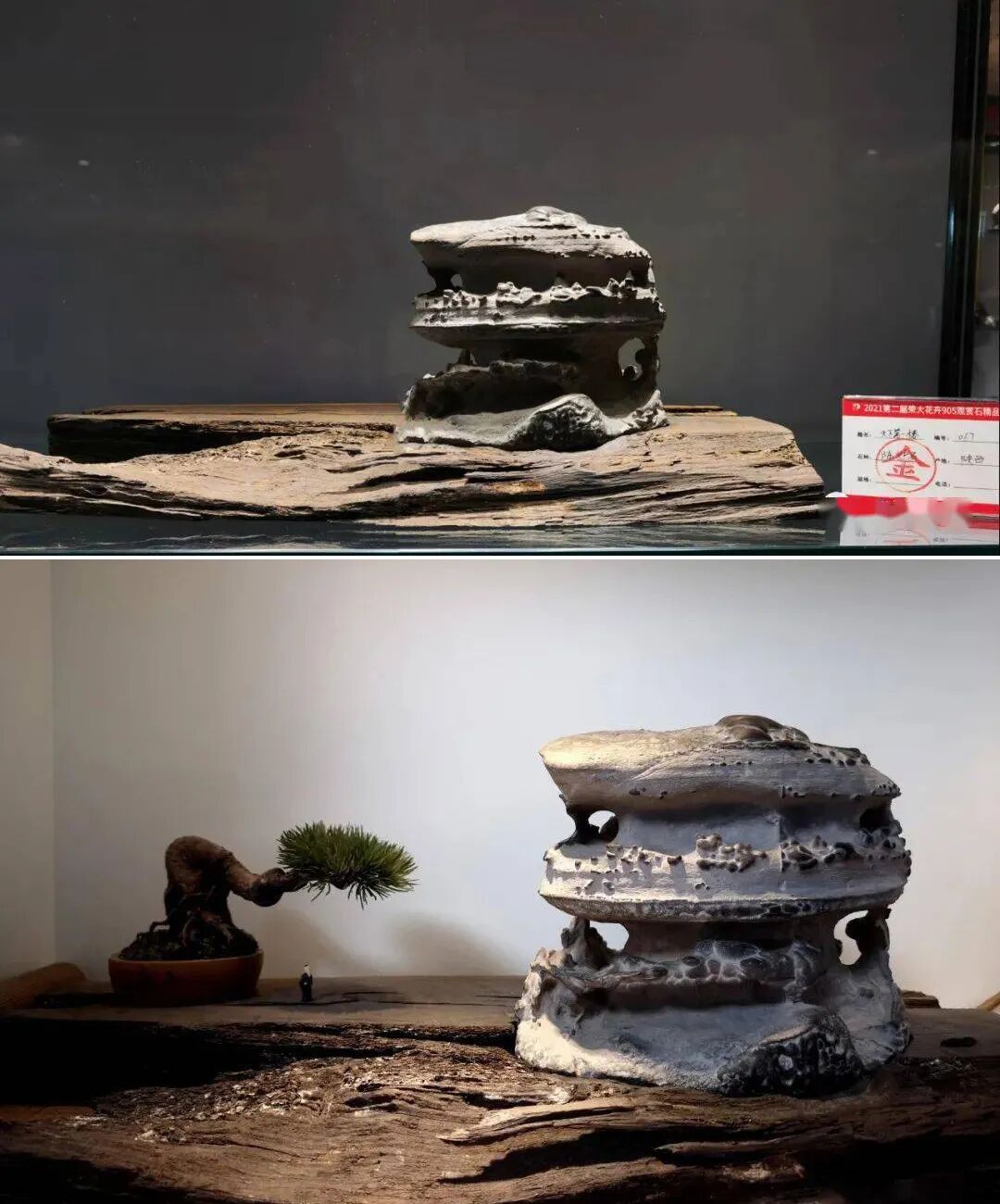 2021年的9月,天津举办石展,穆老师送展的陈炉石《天下第一楼》荣获金奖。在开幕式现场,这块石头被天津奇石藏家刘先生以110万元收藏。至此,这个成交价依然是陈炉石公开成交里的最高价!