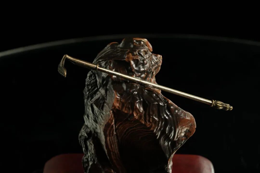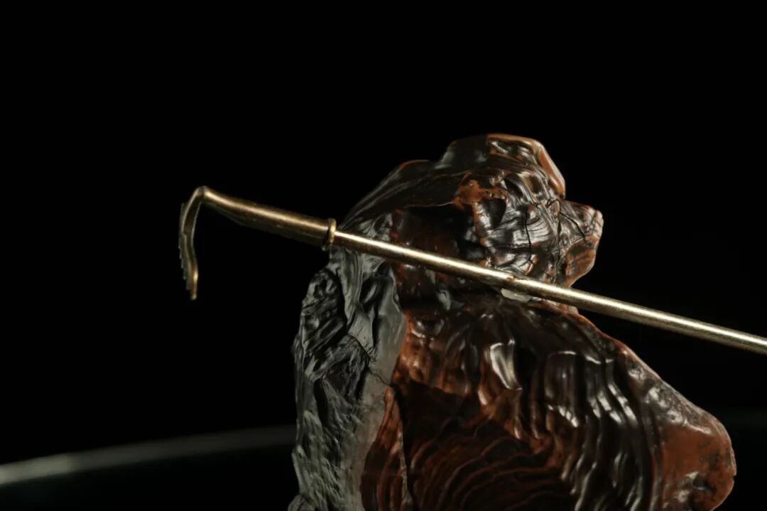 这块石头头身比例到位,头部的鼻子大小恰到好处,脖子粗壮和身体连到一起。戈壁老皮子的纹理形成了衣服或者袈裟的模样。在光线下非常动人。衣服下升出的部分看作是手,扶起铜制的“钉耙”。作为奇石,它形质色纹俱佳!是一块潜力巨大的“名石候选”。