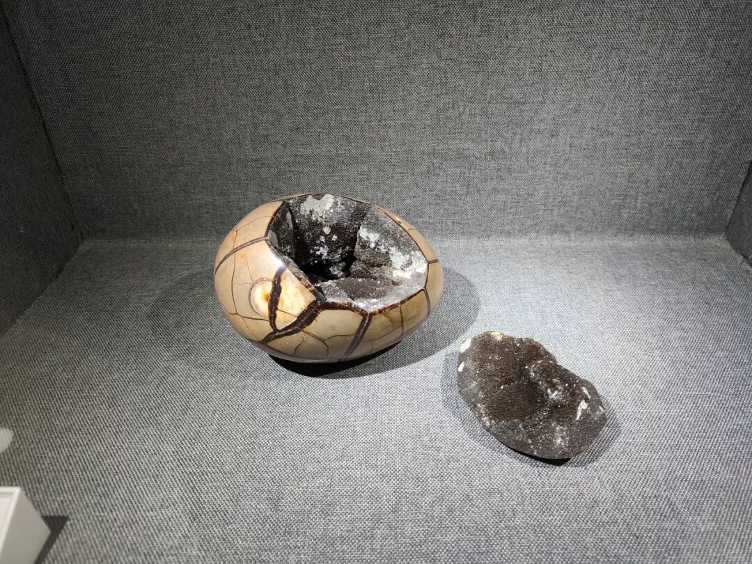 这个石头把裂开的那一片合上去完全就是一个大号的茶叶蛋。但是藏家陈列这个石头的时候是分开陈列的,这就说明它更大的价值点在裂开却没分离,这么说,它就是对石或合石。百万千万年前经历过分离又没有走远。