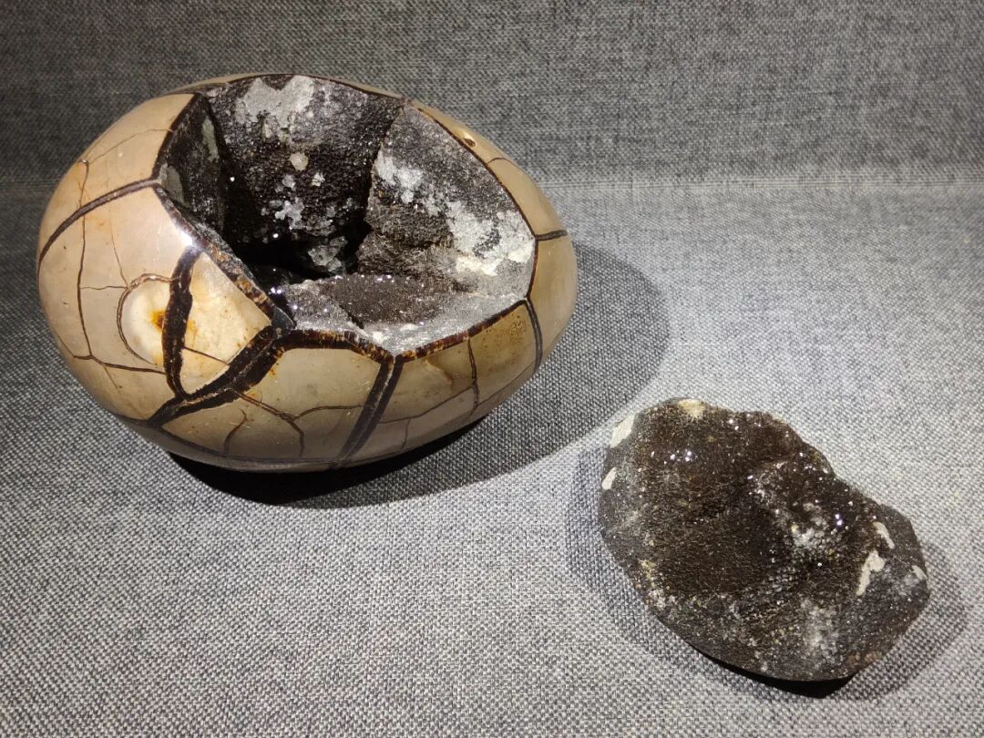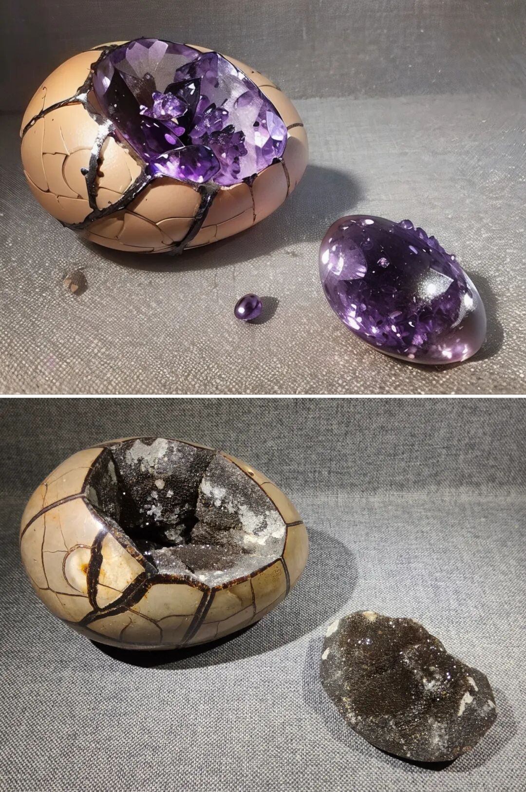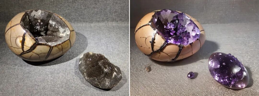 居然还有这样的石头,看下图,这是一块长得像茶叶蛋的石头,但它的内部却藏着一个令人叹为观止的紫晶洞。比较巧妙的是它居然烂了个洞,而更神奇的是掉下来的这一块居然被人找到了。