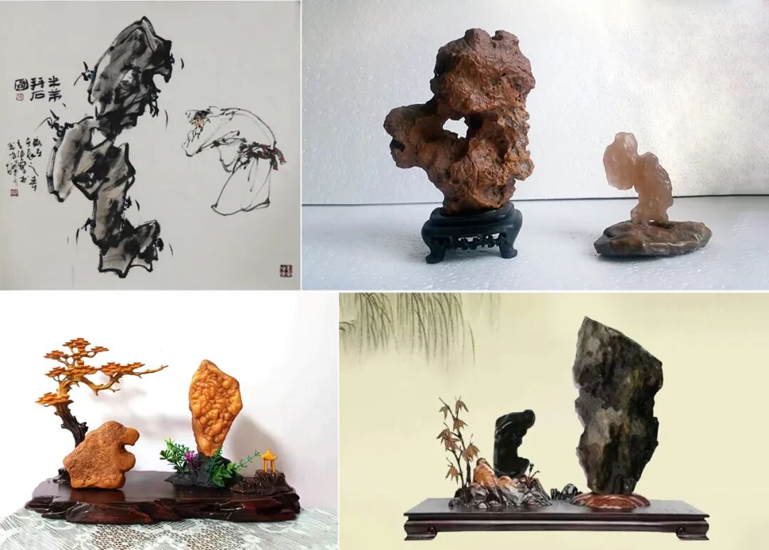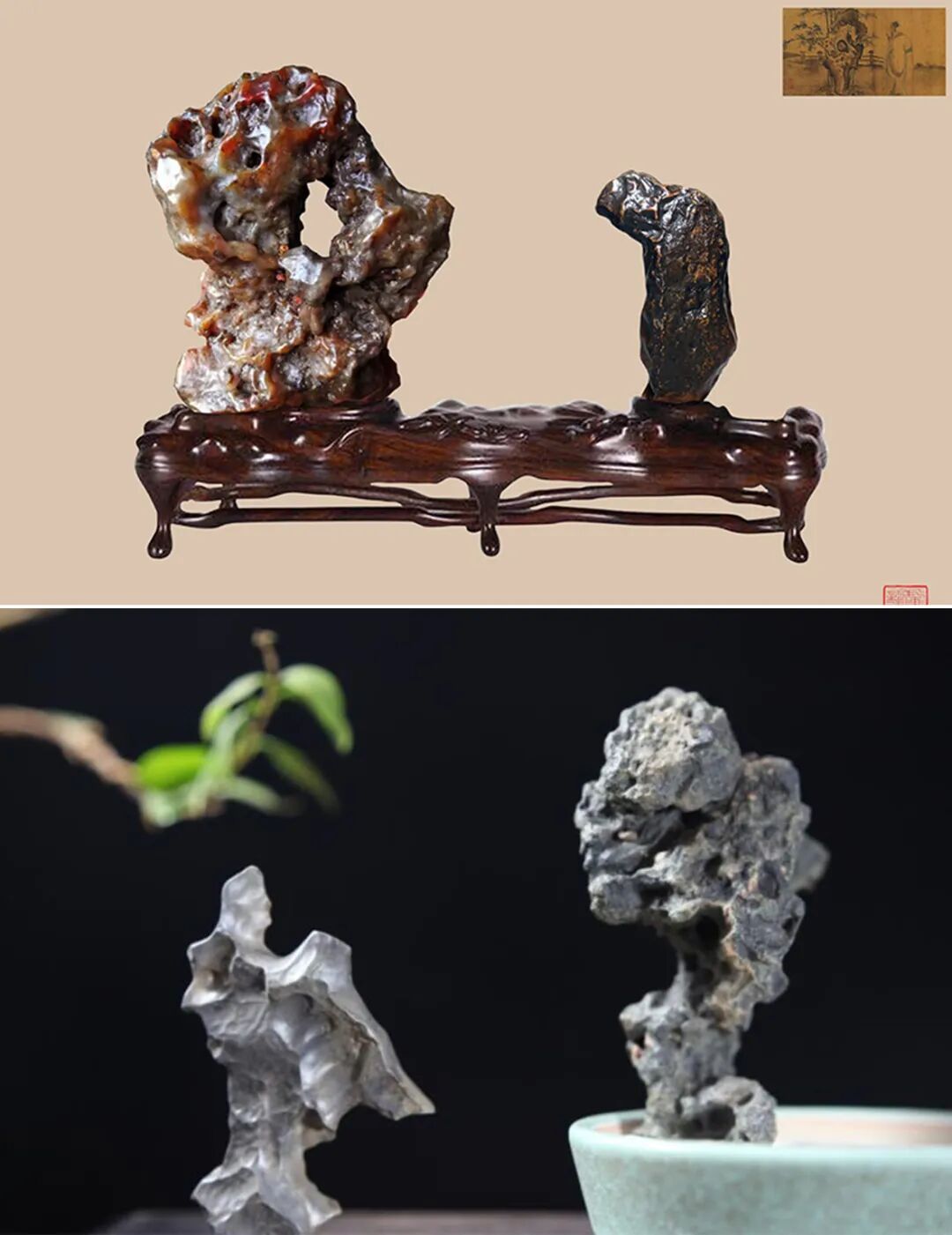 一般大家组小品的习惯也都是同一石种去做组合,能达到一种视觉上的统一性。我们的赏石艺术米芾奖早在第14期的时候,就有两个“米芾拜石”的小品组合,获得了不少赞誉!