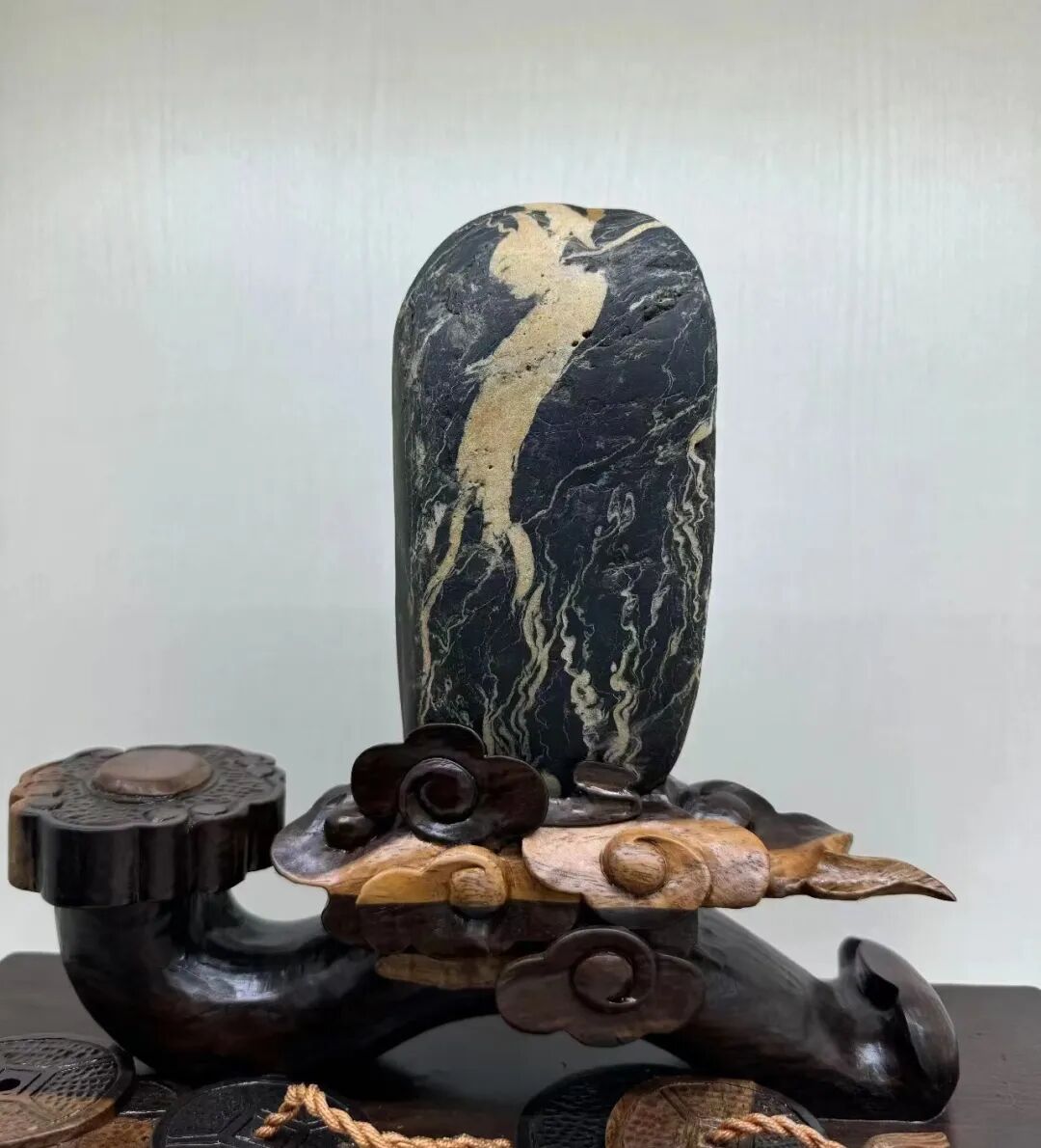 再看欣赏下这块石头本身,今年2月时候,“淘石圈”短视频平台给大家分享过“人参如意”这块汉江水墨石,当时给出的描述如下:汉江水墨画面石,藏家赋名“人参如意”。石质光滑如玉,对比度清晰,仿若一幅水墨画,画面居中,形成的画面顶部恰似人头部逼真的肖像,仿佛与观者对话;而人参根须的展示,则寓意着福禄寿喜之意。此奇石不仅赏心悦目,更是吉祥如意之物。