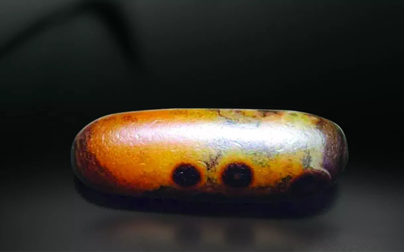 这颗神奇的天珠,让人不禁为之倾倒。故事的主人公,丁先生,第一眼见到它时,被深深地震撼了。这颗冰彩玛瑙天珠长九公分,双头开眼,体开四眼,六通四辟。在它的存在下,仿佛能感受到大自然赋予的磁场。这就是一颗浑然天成的六眼天珠,形体周正、花纹古朴,游涉往来自在,佛界天眼透无碍,美丽极了!