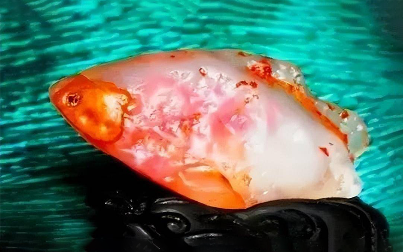 这块奇石真如其名,形态酷似一只小红鱼,栩栩如生。每一个细节都被雕琢得惟妙惟肖,仿佛是大自然亲手雕刻而成。特别是头部,其内部各器官尽收眼底,玛瑙的晶莹使得整体更显生动。翻转奇石,底部的红色胆液形成了一尾灵动的小红鲤,仿佛在腹腔中孕育,而两侧的小黑点巧妙地构成了鱼眼,使整体更富立体感。