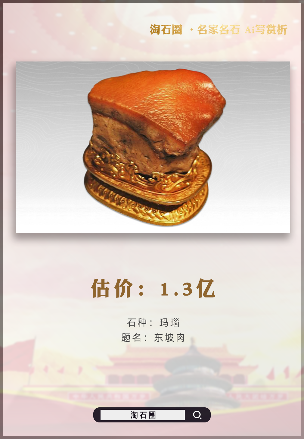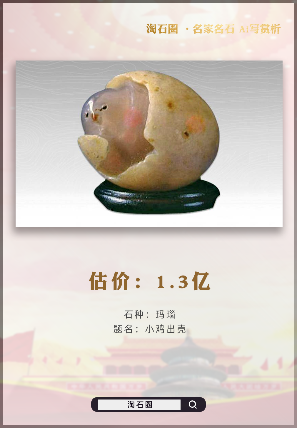 如果真要找一个知名度足够高,还估价过亿并且能得到个别人认可的石头,那可能是小鸡出壳和东坡肉这两个中国四大名石,小鸡出壳进入博物馆算是完成了它的使命,单就知名度而言,绝对是全国排在第一位,而东坡肉也是在博物馆之中,并且有可追溯的历史故事。