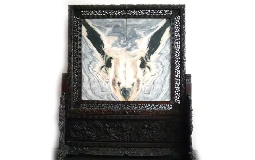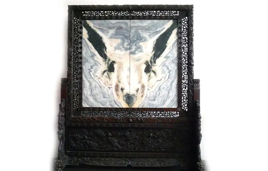 这块大理石插屏的独特之处在于它展现了双重形态,既是凤凰,又是神羊。凤凰象征着祥和、吉祥和重生,而羊则代表着丰饶和祥瑞。这种双重寓意使得这件艺术品更加引人注目。加之红木座屏的配合,更是将中华传统文化和自然奇观完美结合,彰显了对自然和生命的崇敬。