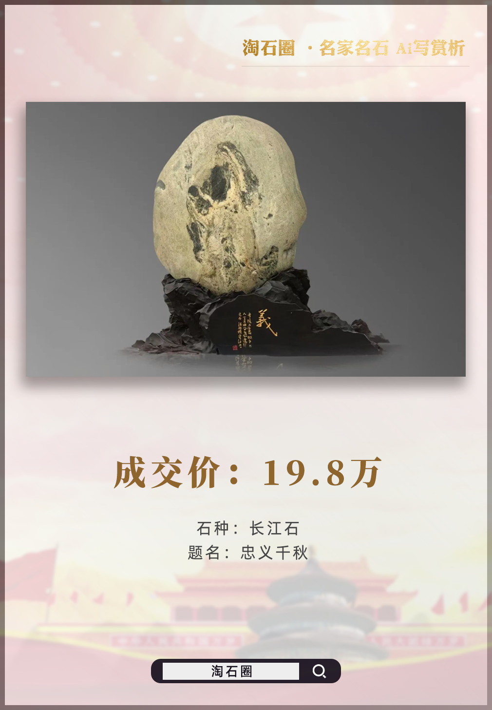 总而言之,这块“忠义千秋”的长江石,不仅具有很高的观赏和收藏价值,更蕴含着丰富的文化内涵。它的高价成交,也反映了人们对传统文化和精神的追求。